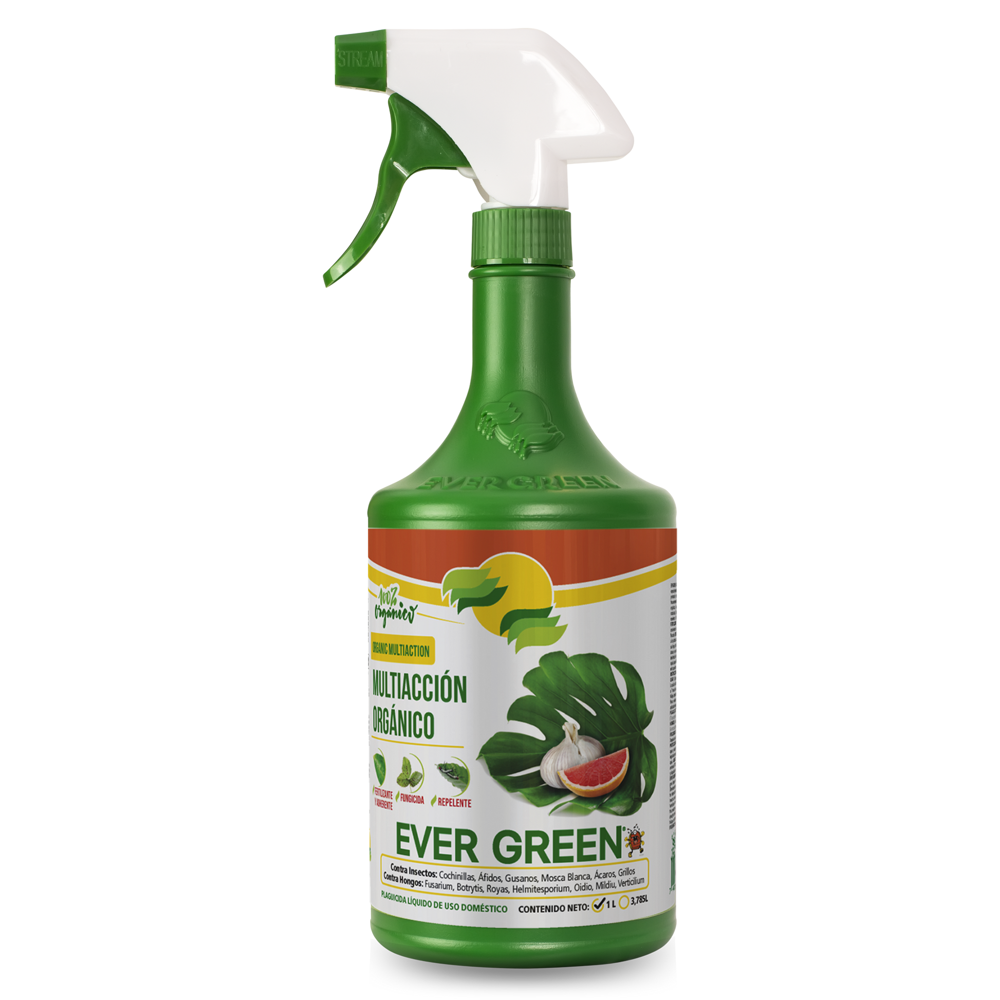 EVER GREEN MULTI-ACTION ORGANIC is a product designed to provide your plants with nutrition and protection against the insects and fungi that frequently attack them. All of its ingredients come from organic sources, ensuring the protection and conservation of nature. The product acts as a fertilizer, fungicide, repellent, and binder, as follows: