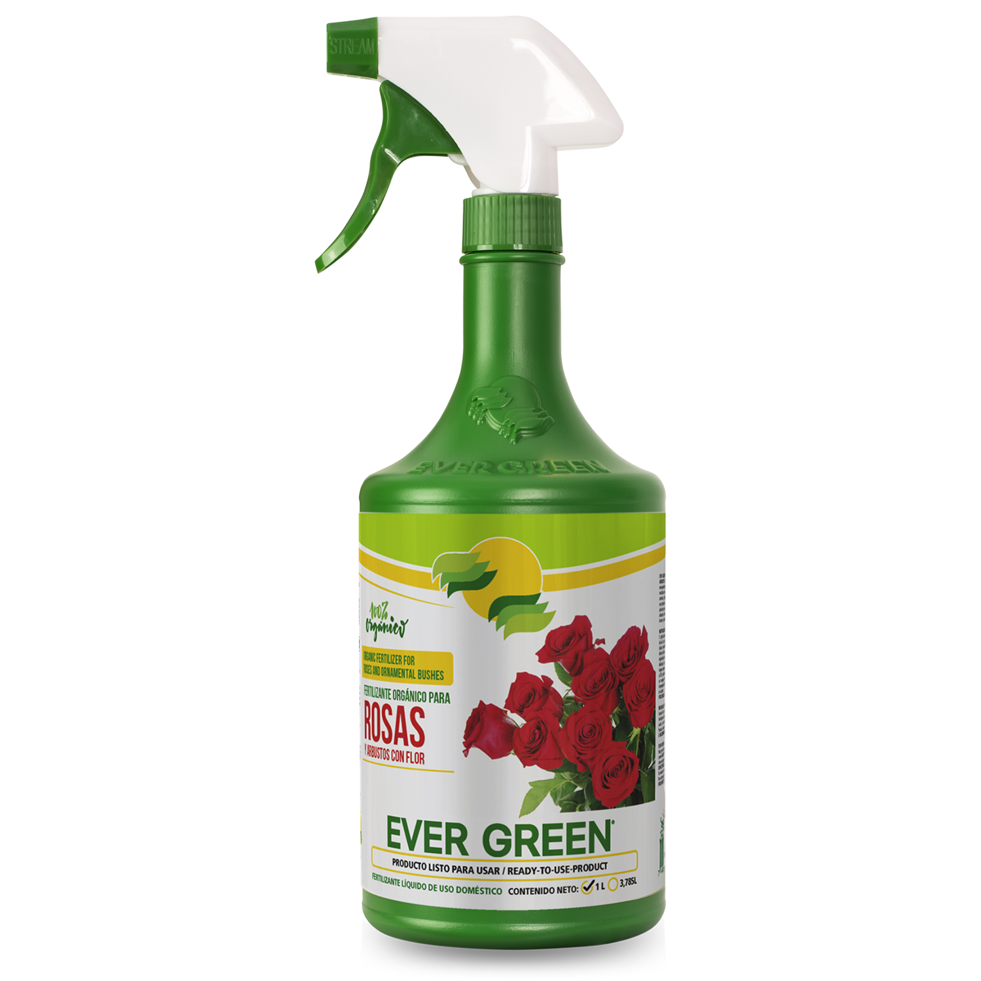 EVER GREEN ORGANIC FERTILIZER FOR ROSES AND FLOWERING SHRUBS is an organic foliar nutrient enriched with hydrolyzed proteins and amino acids that produce rapid results for roses, hydrangeas, summer primroses, azaleas, camellias, and other flowering shrubs. Its nutrients are quickly absorbed through the roots and leaves.